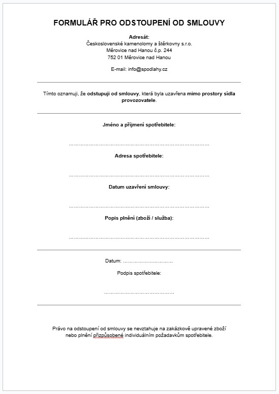 Pro odstoupení od smlouvy může spotřebitel využít formulář dostupný ZDE: